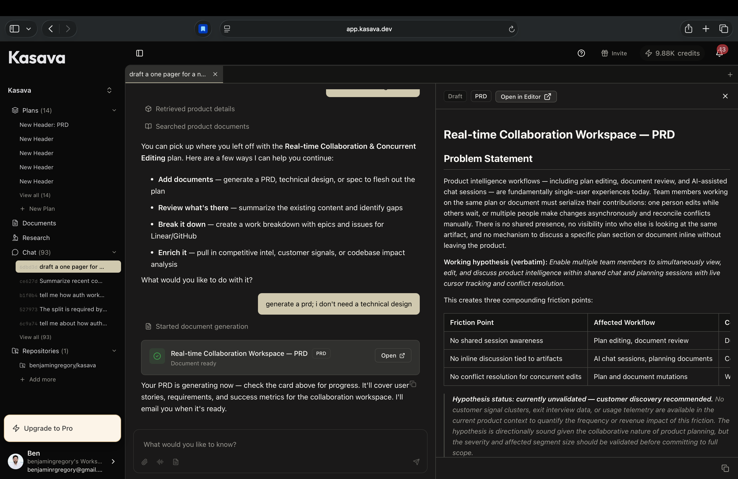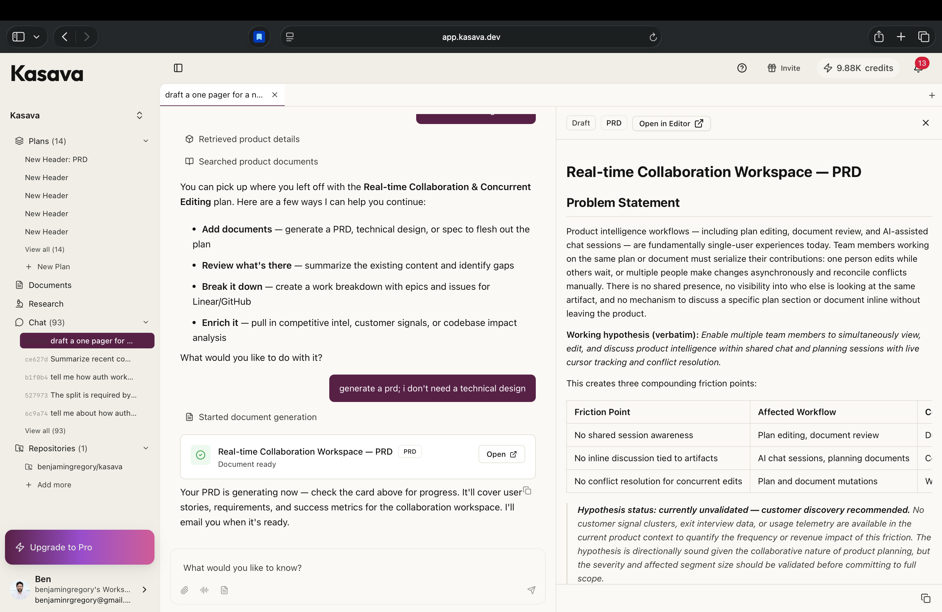 Type what you need — a PRD, a one-pager, a technical design. The AI drafts it in your editor, pre-filled with real context from your codebase and docs.